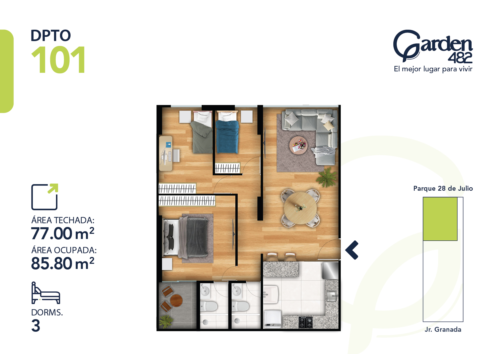Garden 482 es un proyecto que busca combinar la practicidad, funcionalidad de un buen diseño con la calma de un oasis, por ello , cuenta con acceso y vista exclusiva a parque. Un proyecto tan exclusivo que cuenta solo con 27 departamentos.